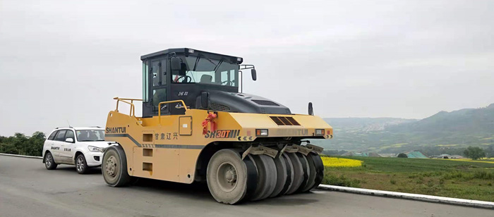 在甘肅省某道路上,山推攤鋪機(jī)和壓路機(jī)等成套路面施工設(shè)備正有條不紊地進(jìn)行水穩(wěn)層施工,山推SRP 95-3大厚度攤鋪機(jī),一次攤鋪10.5米,攤鋪?zhàn)鳂I(yè)厚度35mm,攤鋪速度快,離析低、平整度高;山推壓路機(jī)緊跟攤鋪機(jī)進(jìn)行壓實(shí)作業(yè),壓實(shí)質(zhì)量完全達(dá)到規(guī)范要求。山推路面設(shè)備以其高質(zhì)量、高效率贏得當(dāng)?shù)乜蛻舻膹V泛好評(píng)。
